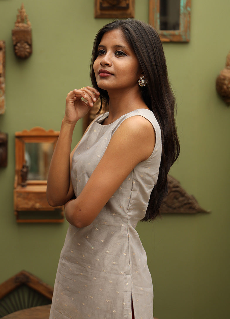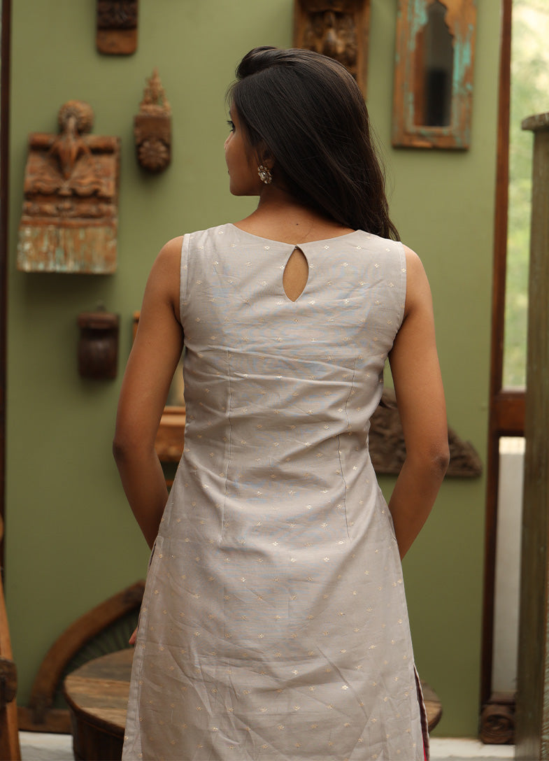 Embrace understated luxury with our Ivory Elegance set — a contemporary classic that blends minimal charm with vibrant contrast. The sleeveless Chanderi kurta in a soothing grey tone features delicate woven dots, adding a subtle sheen and texture. Paired with stunning full flare organza pants in a rani pink, this set creates a statement silhouette that flows gracefully with every step. Designed for versatility and comfort, this ensemble transitions effortlessly from festive celebrations to refined daytime gatherings.