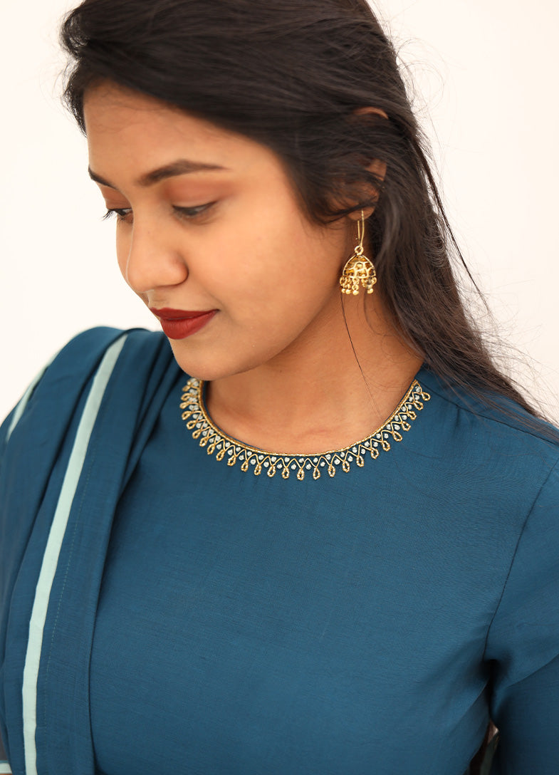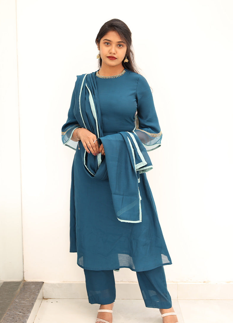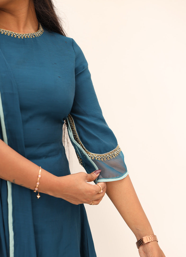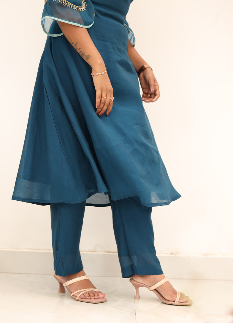 The A-line kurta is adorned with a delicate embroidered neckline and organza-trimmed bell sleeves, adding a graceful touch to the classic design.