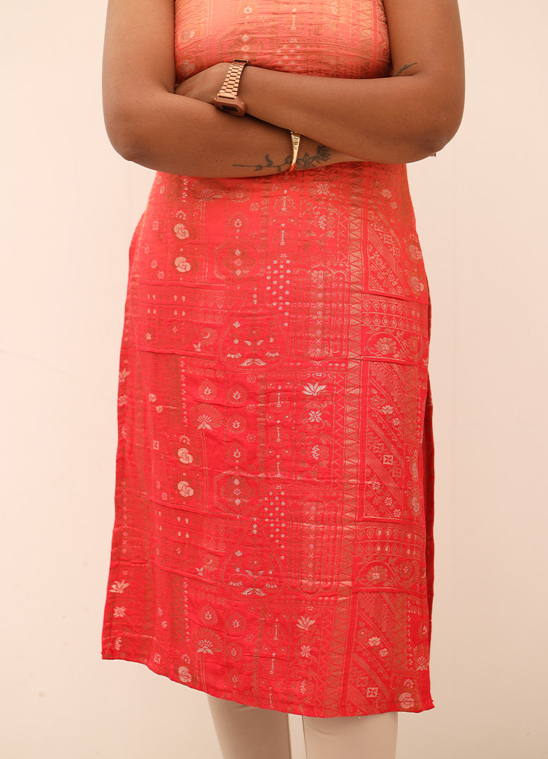 Drape yourself in elegance with the Coral Sunset Pure Banarasi Ombre Top, a stunning fusion of traditional artistry and contemporary style. Crafted from luxurious pure Banarasi fabric, this sleeveless top showcases exquisite woven zari motifs that lend a subtle festive sheen, making it perfect for special occasions or a chic evening out.