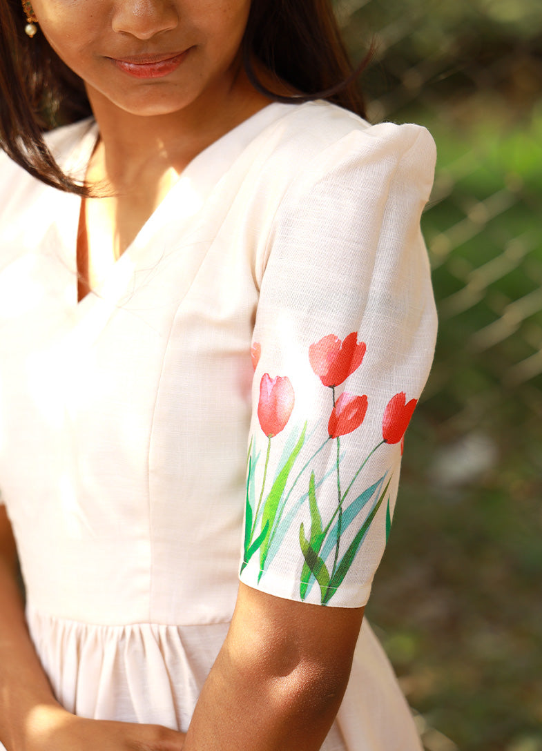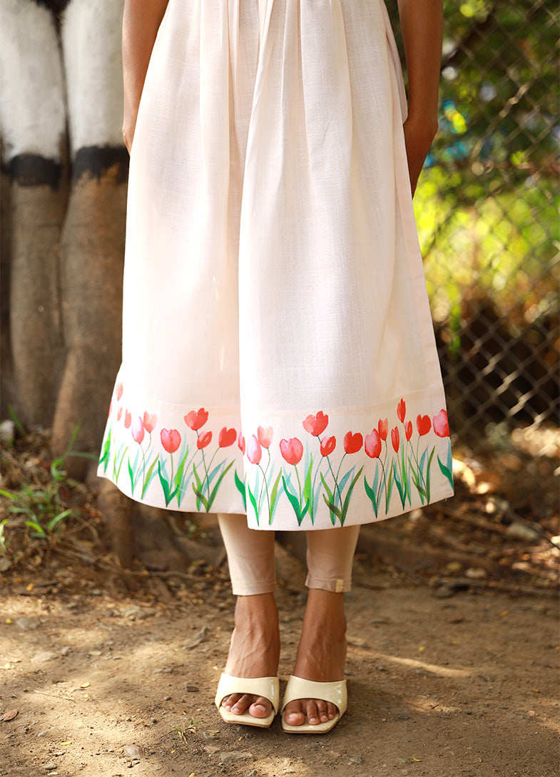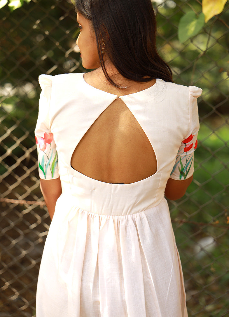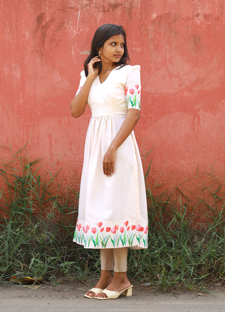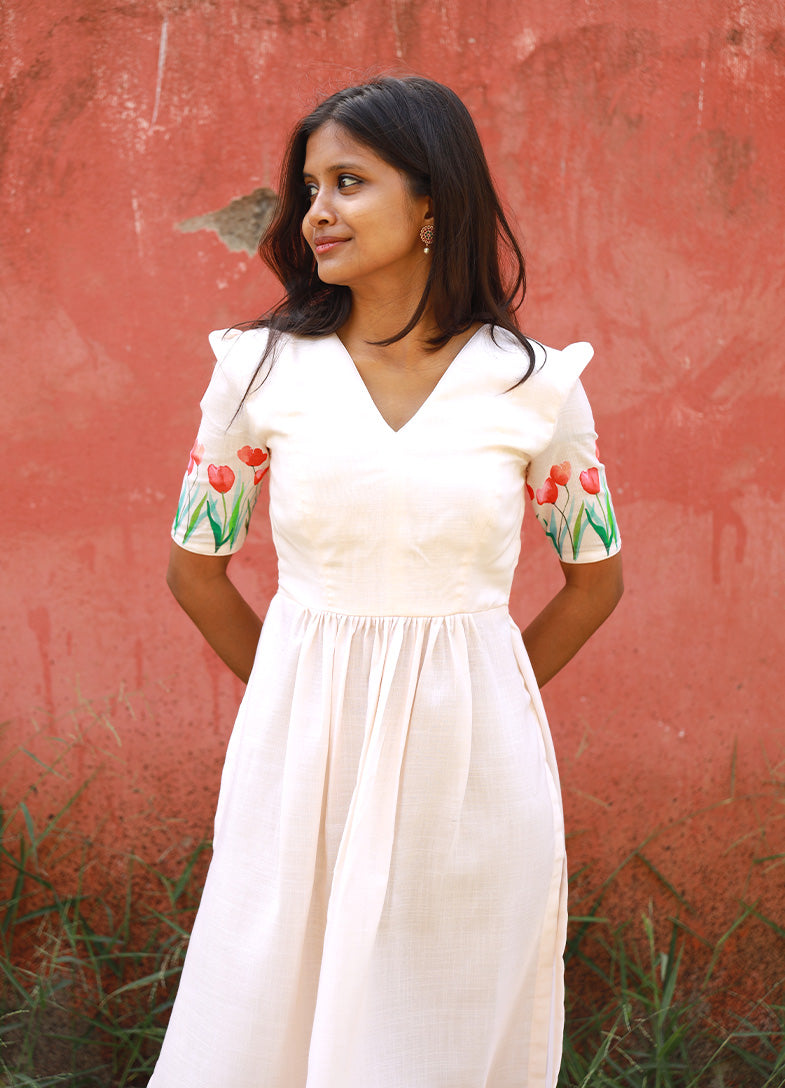 The highlight of the piece lies in its delicate hand-painted tulip motifs along the sleeves and hemline, adding a burst of cheerful color and artisanal charm. Perfect for daytime events, brunches, or a leisurely stroll in the sun, this dress blends elegance with a touch of playfulness.