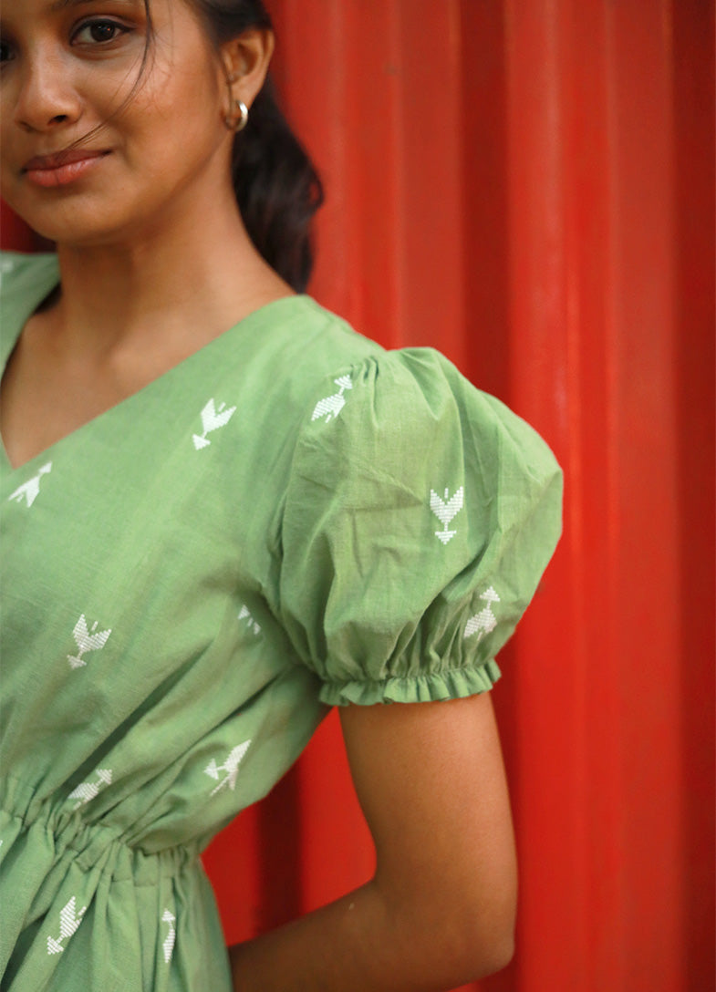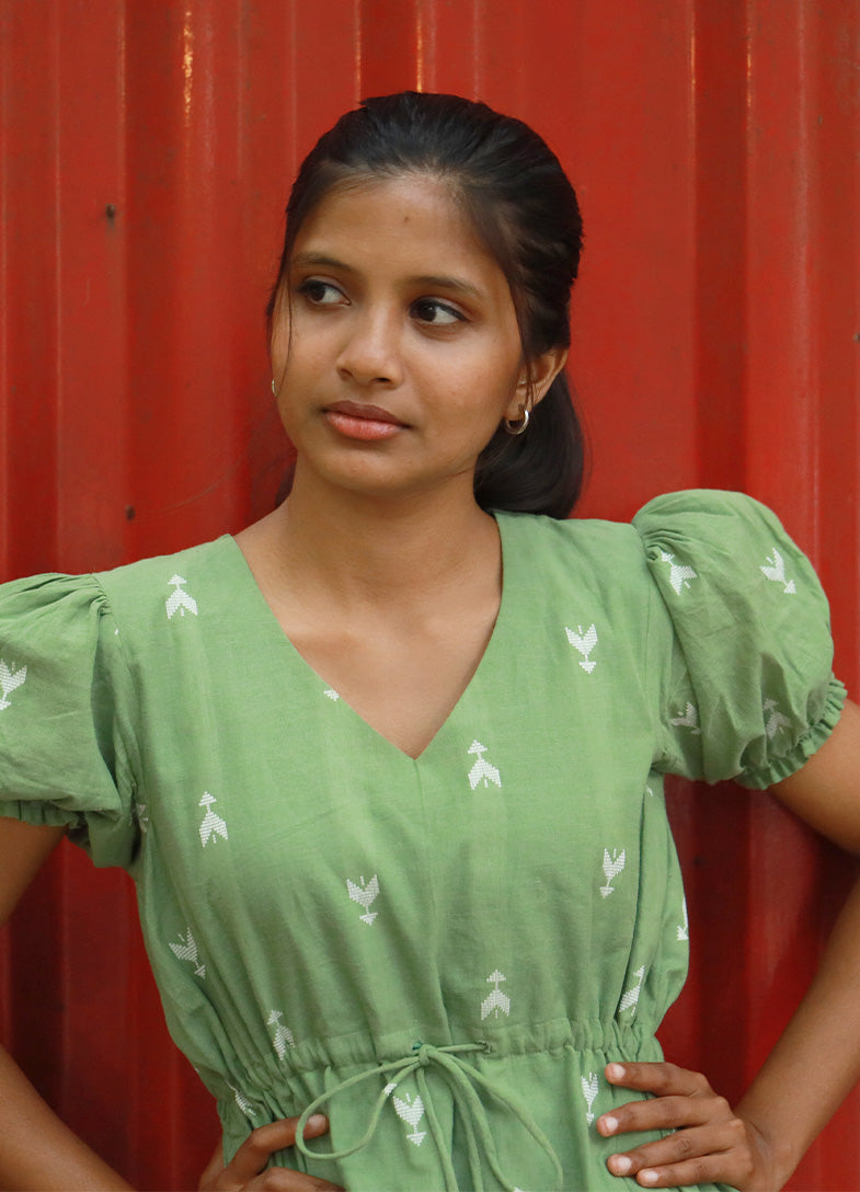 Simple, soft, and thoughtfully detailed — the Olive Sprig Co-ord Set is crafted in breathable handwoven cotton with subtle white woven motifs on a calming olive-green base. The top features a flattering V-neckline, puffed sleeves, and a drawstring waist with tassel ties that gently cinch the silhouette.